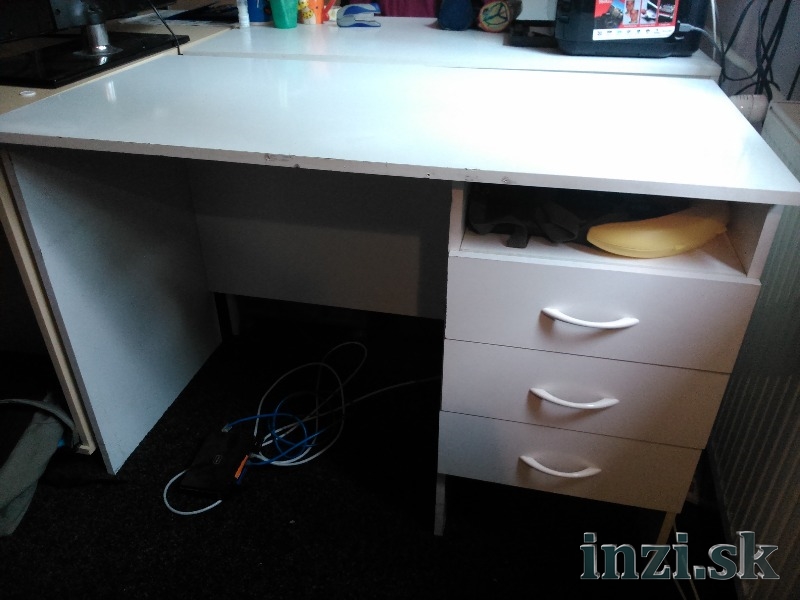 Predám dva písacie biele stoly(jeden má šuflíky napravo,druhý vľavo) jeden za 25e(na cene je mozne dohodnut sa). Rozmery sú výška 75cm, dĺžka 110cm, šírka 55cm.