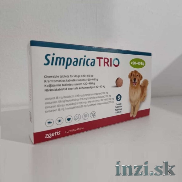 Simparica Trio je pokročilá žuvacia liečba s príchuťou pečene, ktorá je určená špeciálne pre psov. Táto ľahko podávateľná perorálna mesačná liečba chráni psy pred srdcovými červami, ako aj pred kliešťami, blchami a črevnými červami, ako sú škrkavky a hlísty. Dokáže eliminovať až päť druhov kliešťov: kliešte z pobrežia Mexického zálivu, kliešte americké, kliešte Lone Star, kliešte jelene a kliešte hnedé. Simparica Trio zabíja blchy skôr, ako môžu naklásť vajíčka, a začína zabíjať existujúce blchy do 4 hodín. Okrem toho je táto liečba schválená pre šteniatka a psy staršie ako 8 týždňov.